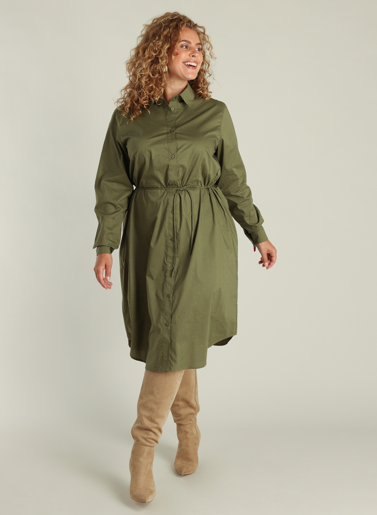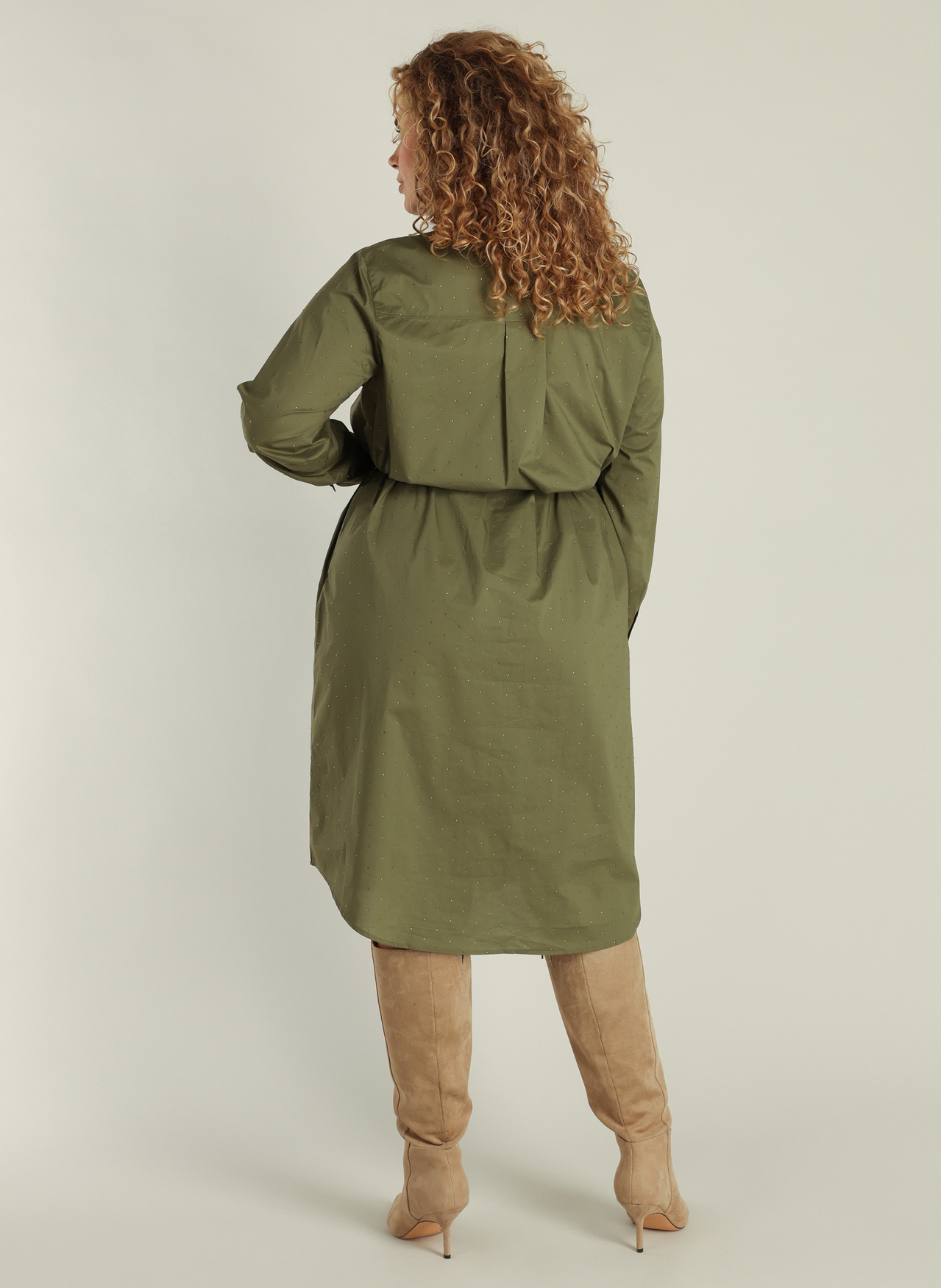 De grey-olive kleur en lange mouwen maken deze knielange jurk veelzijdig en geschikt voor zowel casual als feestelijke gelegenheden. Combineer hem met laarzen of pumps voor een complete look.