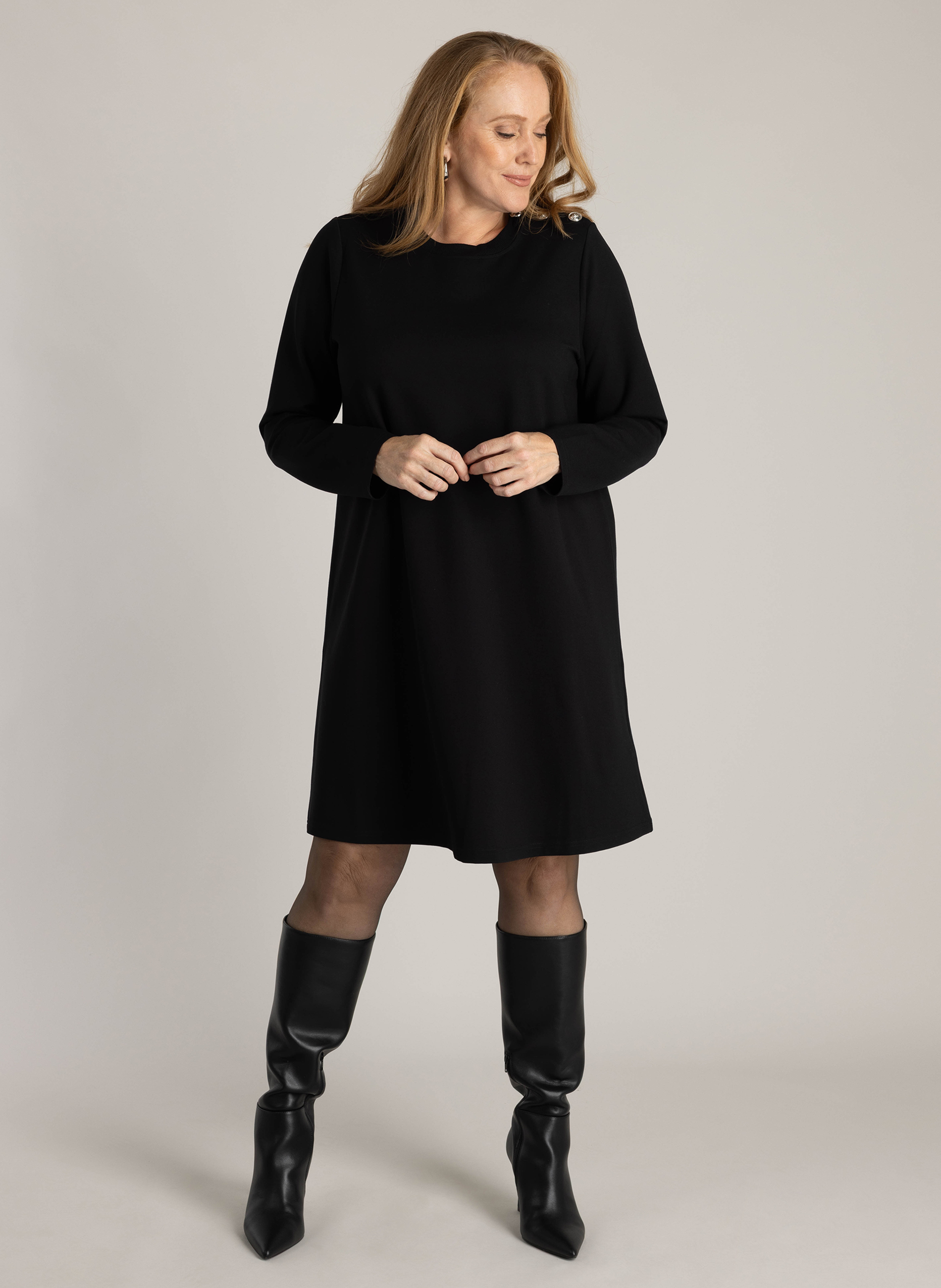 De jurk heeft lange mouwen en is voorzien van knopen op de schouder als stijlvol detail, wat het ontwerp subtiel bijzonder maakt. Met een lengte van circa 100 cm valt de jurk mooi over de knieën, waardoor hij eenvoudig te combineren is met sneakers voor een casual look of met hakken voor een nettere outfit. De YEST CURVE Sweatjurk is een tijdloos item dat veelzijdig te stylen is en ideaal voor dames die houden van comfortabele grote maten kleding.