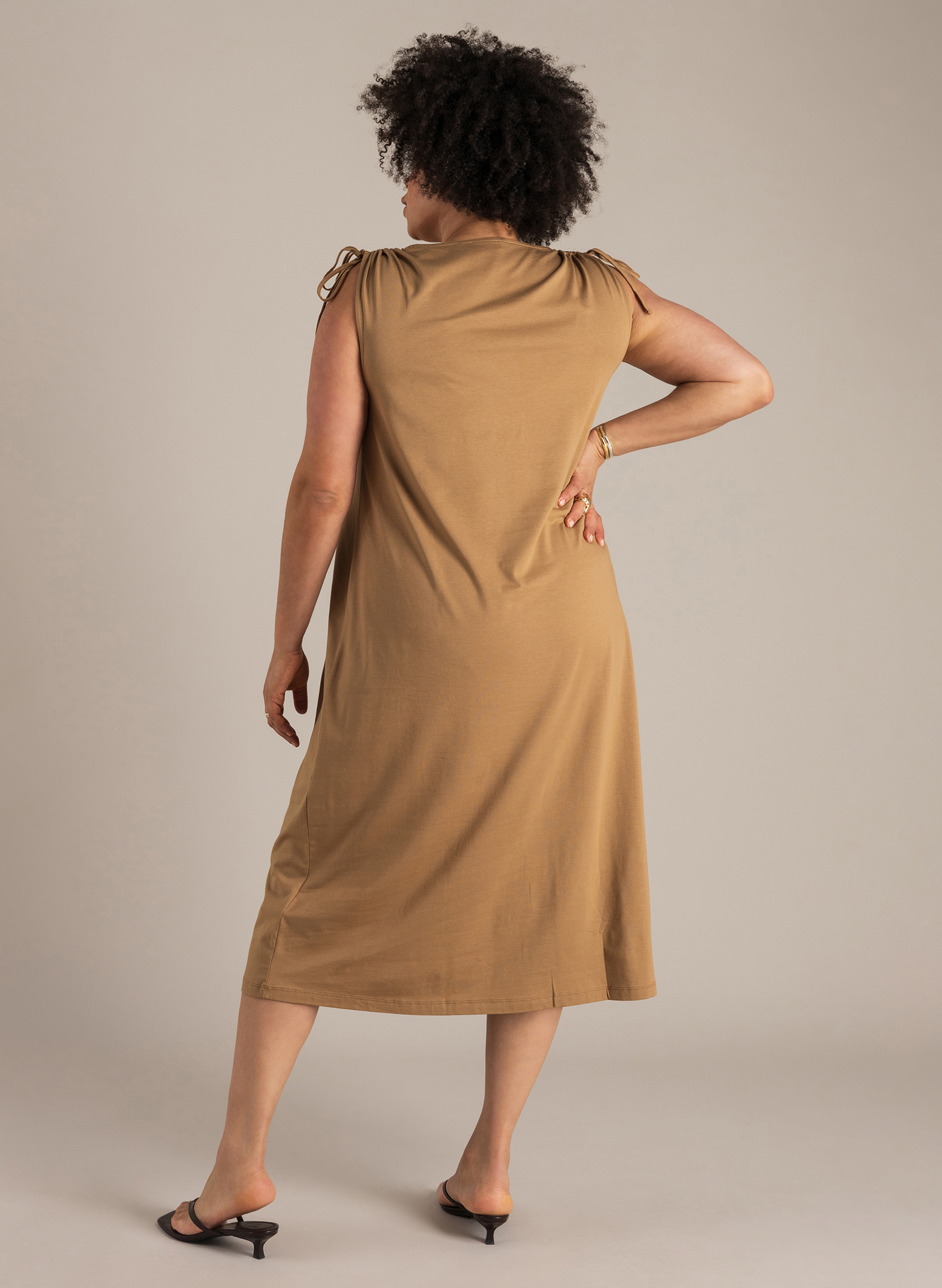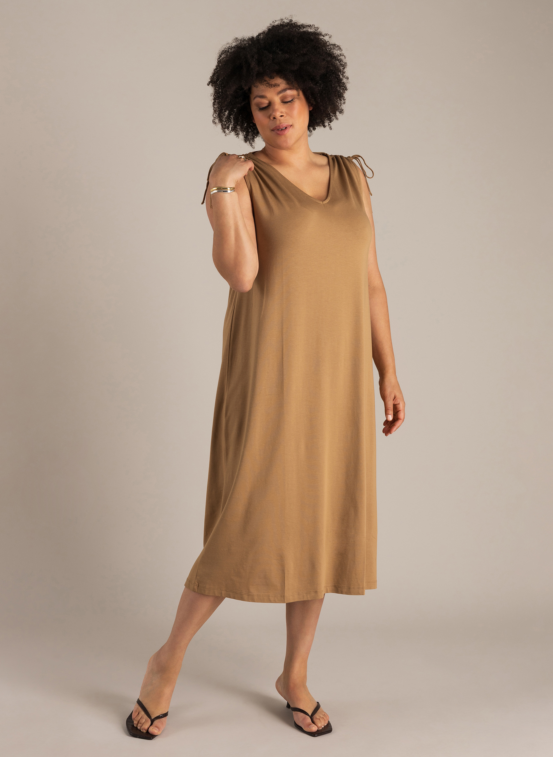 Deze lange YEST CURVE jurk A006341 is een stijlvolle toevoeging aan je collectie grote maten kleding. Het model heeft een rechte pasvorm en volgt het lichaam op een natuurlijke manier, wat zorgt voor een comfortabele look. De jurk is vervaardigd uit een soepele jersey stof van 48% modal, 48% katoen en 4% elastane, waardoor de stof licht elastisch is en prettig draagt op warme dagen. Met een lengte van 125 centimeter valt dit item mooi lang. Dankzij de V-hals en de verschuifbare schouderpartij is de pasvorm eenvoudig aan te passen naar jouw wens. Of je nu kiest voor de kleur rood of taupe, met deze jurk van YEST CURVE kies je voor een comfortabel en veelzijdig item dat perfect past bij een stijlvolle plus size garderobe.
