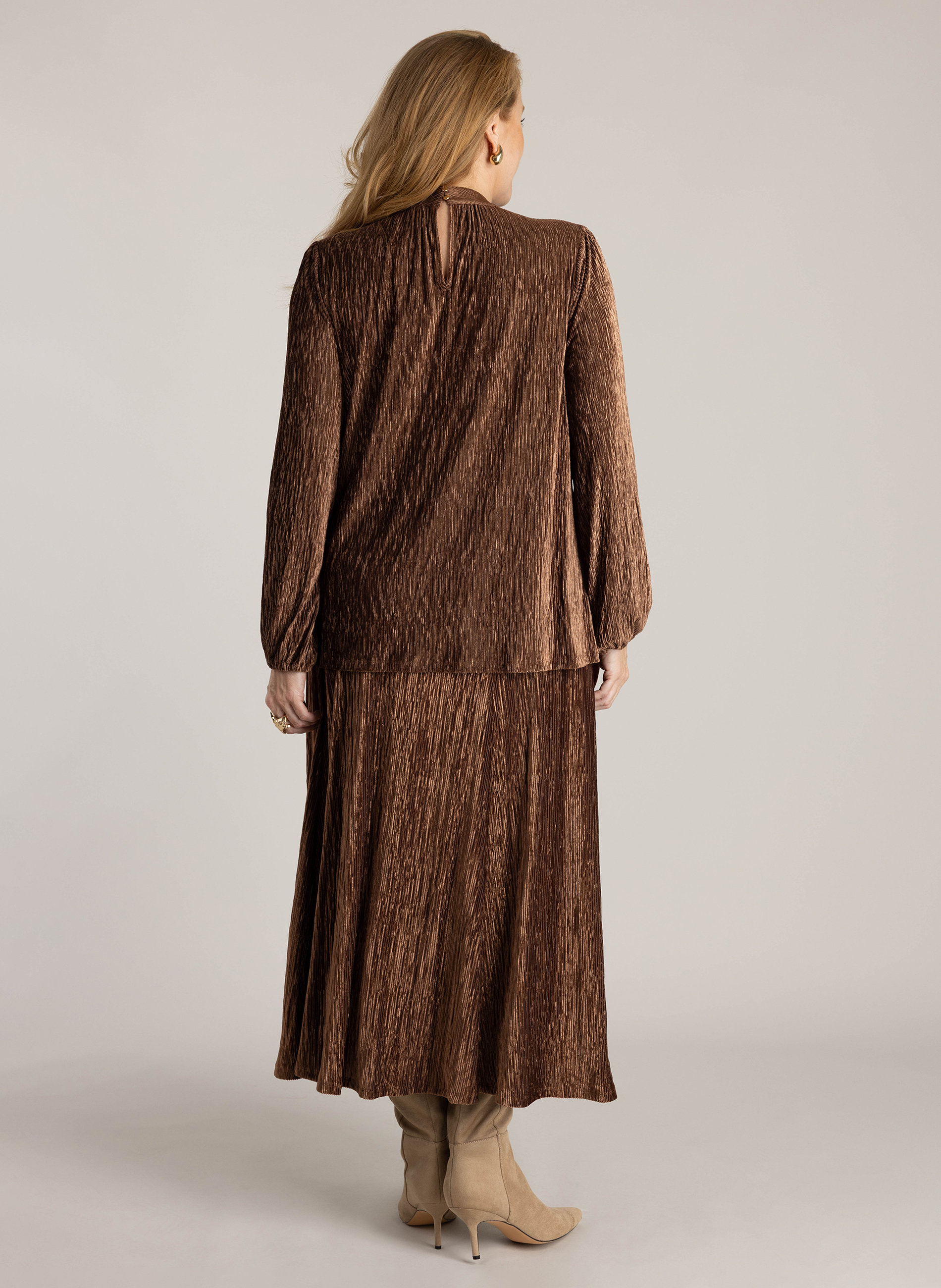 Met een lengte van 72 cm en een regular fit pasvorm valt de top mooi om het lichaam, terwijl de wijde mouwen met elastische manchetten extra volume en beweging geven. De warme tint copper brown maakt deze top perfect voor feestelijke gelegenheden, maar ook stijlvol genoeg om te combineren met een broek of rok voor een chique dagelijkse look.