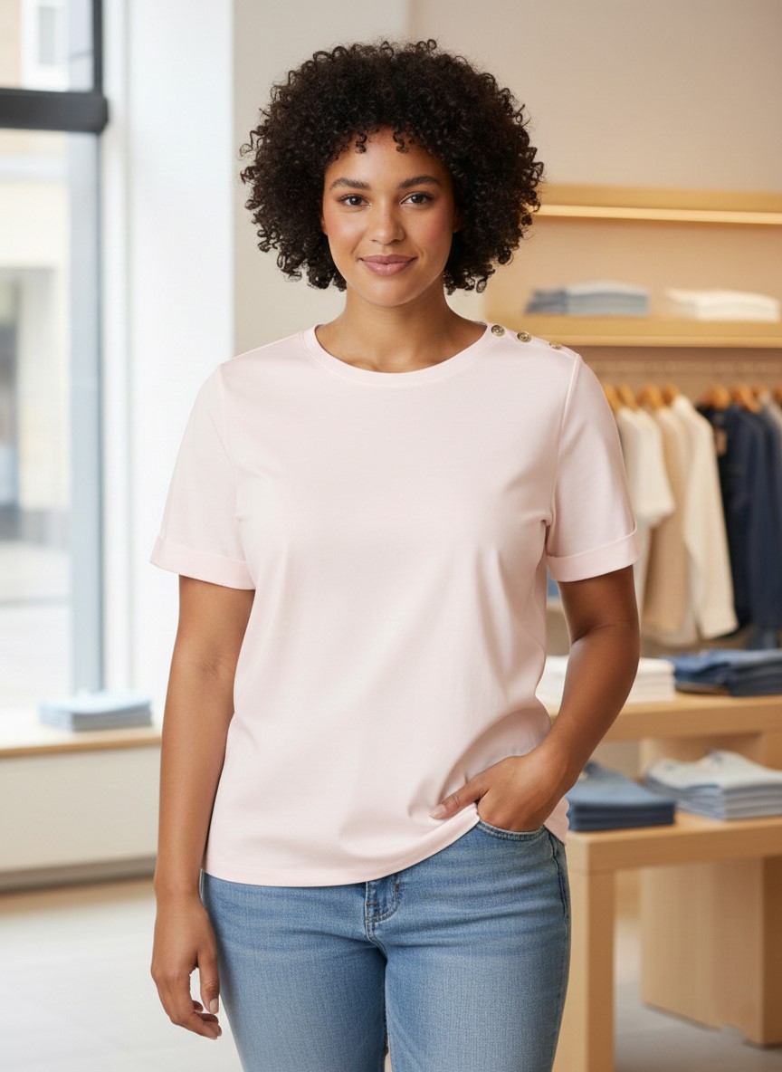Het Jacinthe T-shirt van YEST CURVE is een top waar alles aan klopt: zacht, stevig en met fijne details zoals omslagmouwtjes en knoopjes op de schouder. Het T-shirt heeft een regular fit en zit heerlijk relaxed bij maatje meer. De lengte van het T-shirt is 74 cm, waardoor het mooi valt over het lichaam.