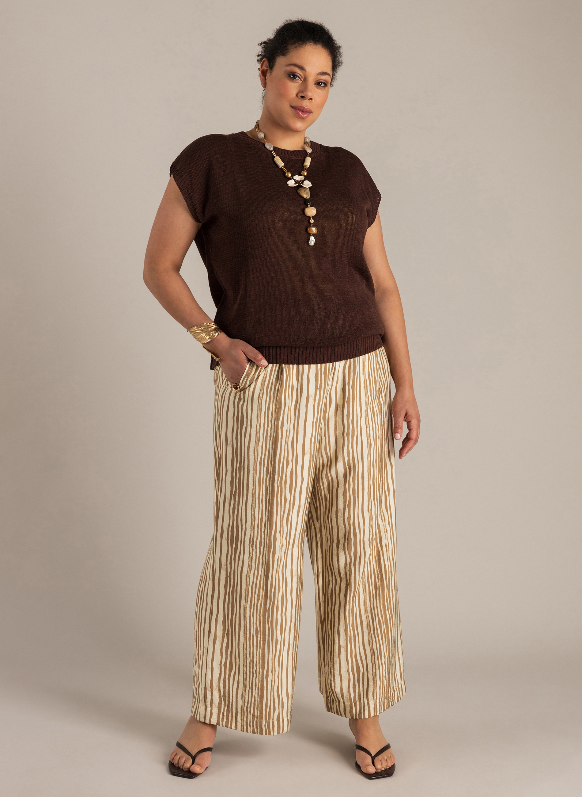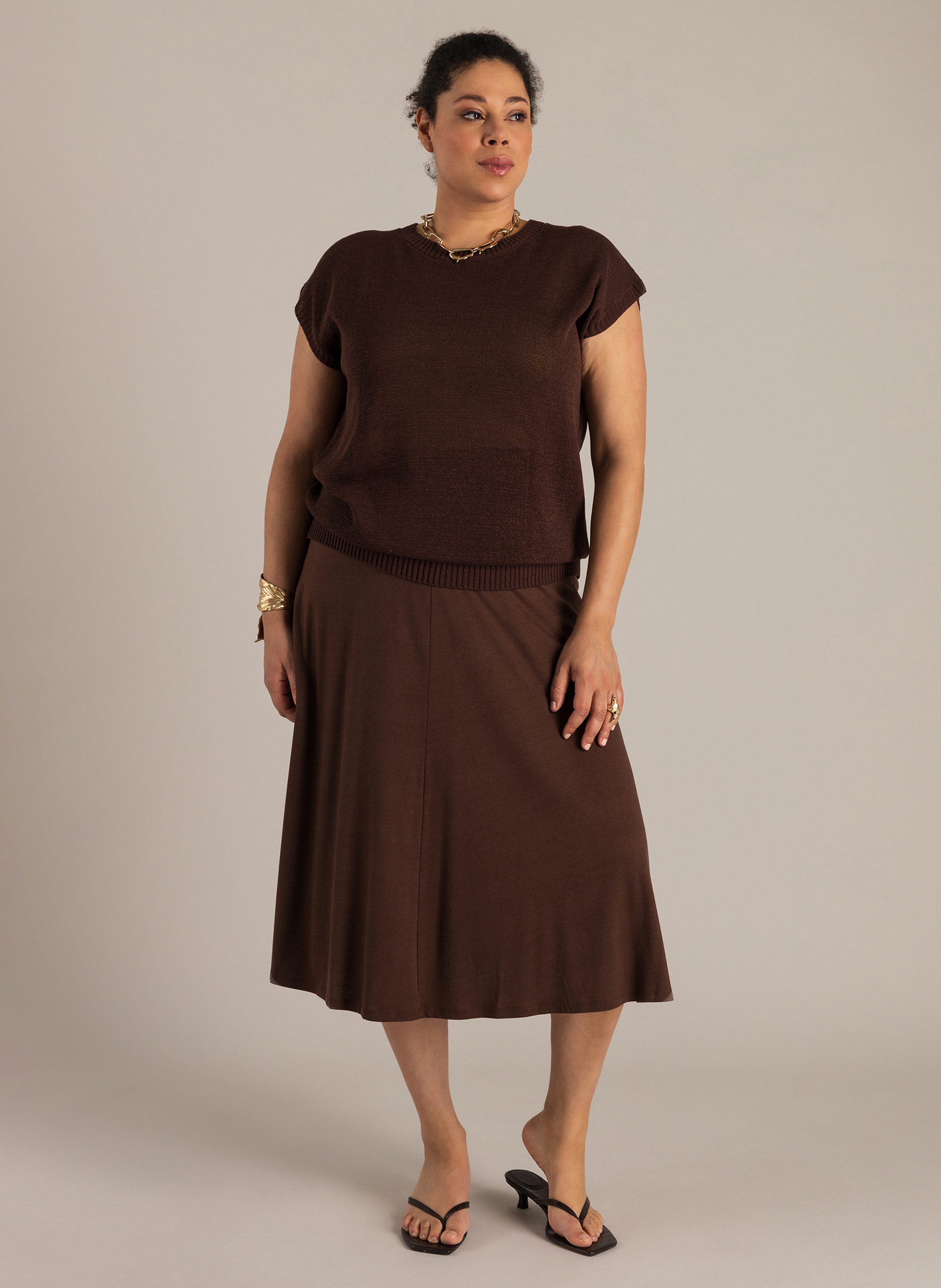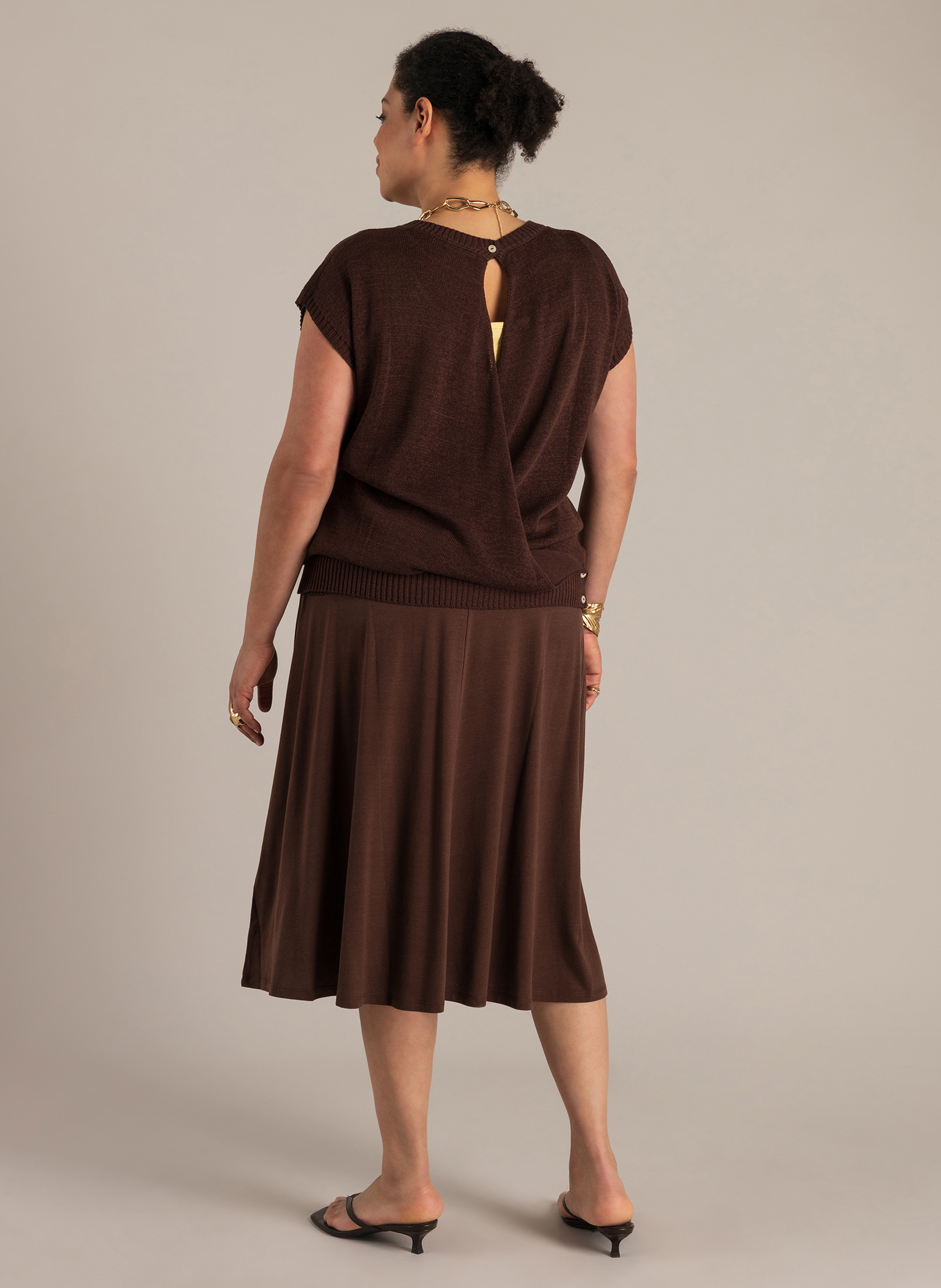 Dit truitje verrast zodra je je omdraait. De voorkant oogt clean, terwijl de overslag aan de achterkant zorgt voor een speels, open detail. De gebreide katoenmix voelt prettig aan en maakt het een fijne keuze voor dagen waarop je iets lichts wilt dragen.