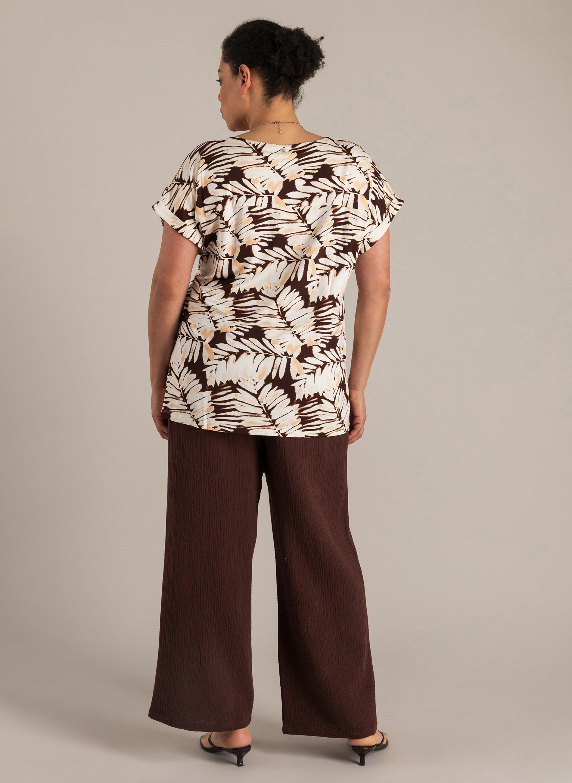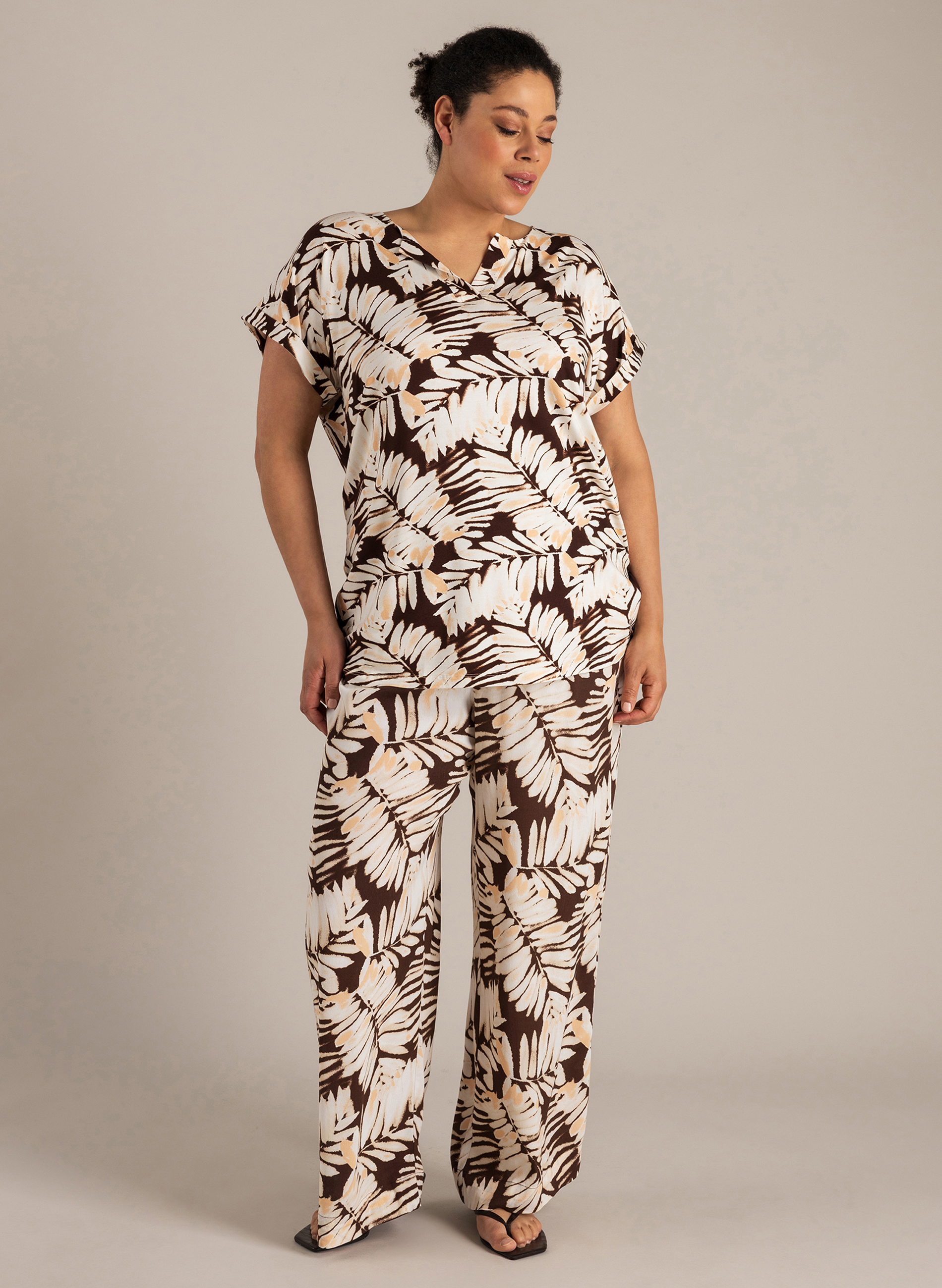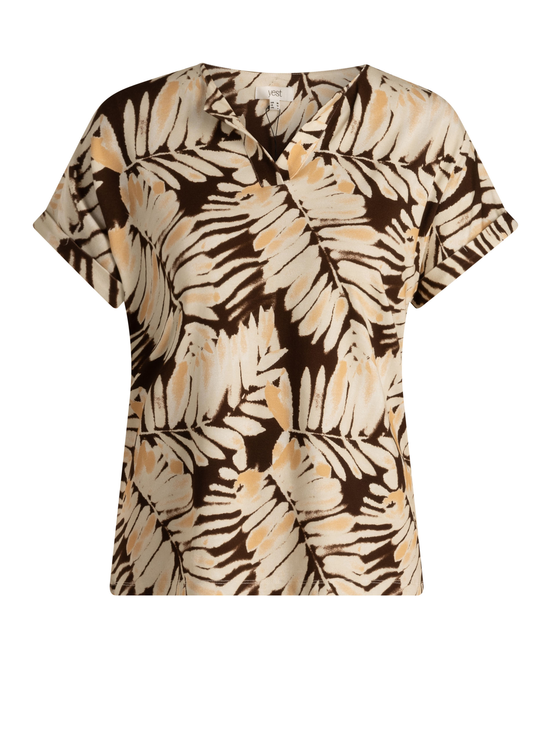 Dit T-shirt is gemaakt van een soepele jersey kwaliteit die zacht aanvoelt en licht meerekt. De kapmouwtjes zorgen voor een comfortabele pasvorm rond de schouders. De V-hals met kleine split en de allover print geven het ontwerp een opvallend, zomers karakter.