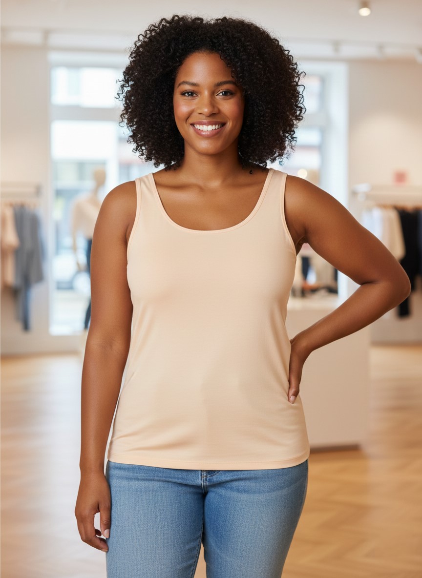 Een dames singlet uit de Yest Curve collectie voor vrouwen met een maatje meer. Het singlet heeft een ronde hals en geen mouwen. Het is gemaakt van een zachte katoen‑en‑modalmix die prettig voelt op de huid en wat stretch heeft zodat het comfortabel draagt. Het ontwerp is eenvoudig en veelzijdig, waardoor je het makkelijk kunt combineren met broeken, rokken of onder een jasje voor verschillende outfits.