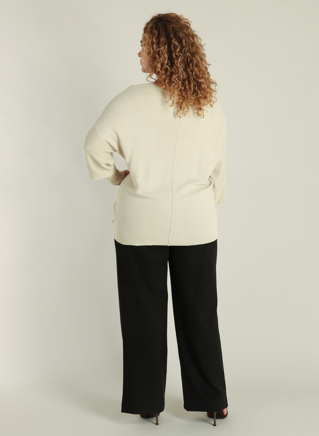 De vleermuismouwen geven extra ruimte en comfort, terwijl de manchetten met knoopjes een stijlvol contrast vormen. Het subtiele glittertje maakt de sweater bijzonder zonder te overheersen, ideaal voor zowel casual dagen als feestelijke gelegenheden. Verkrijgbaar in twee kleuren, zodat je altijd de perfecte match vindt.