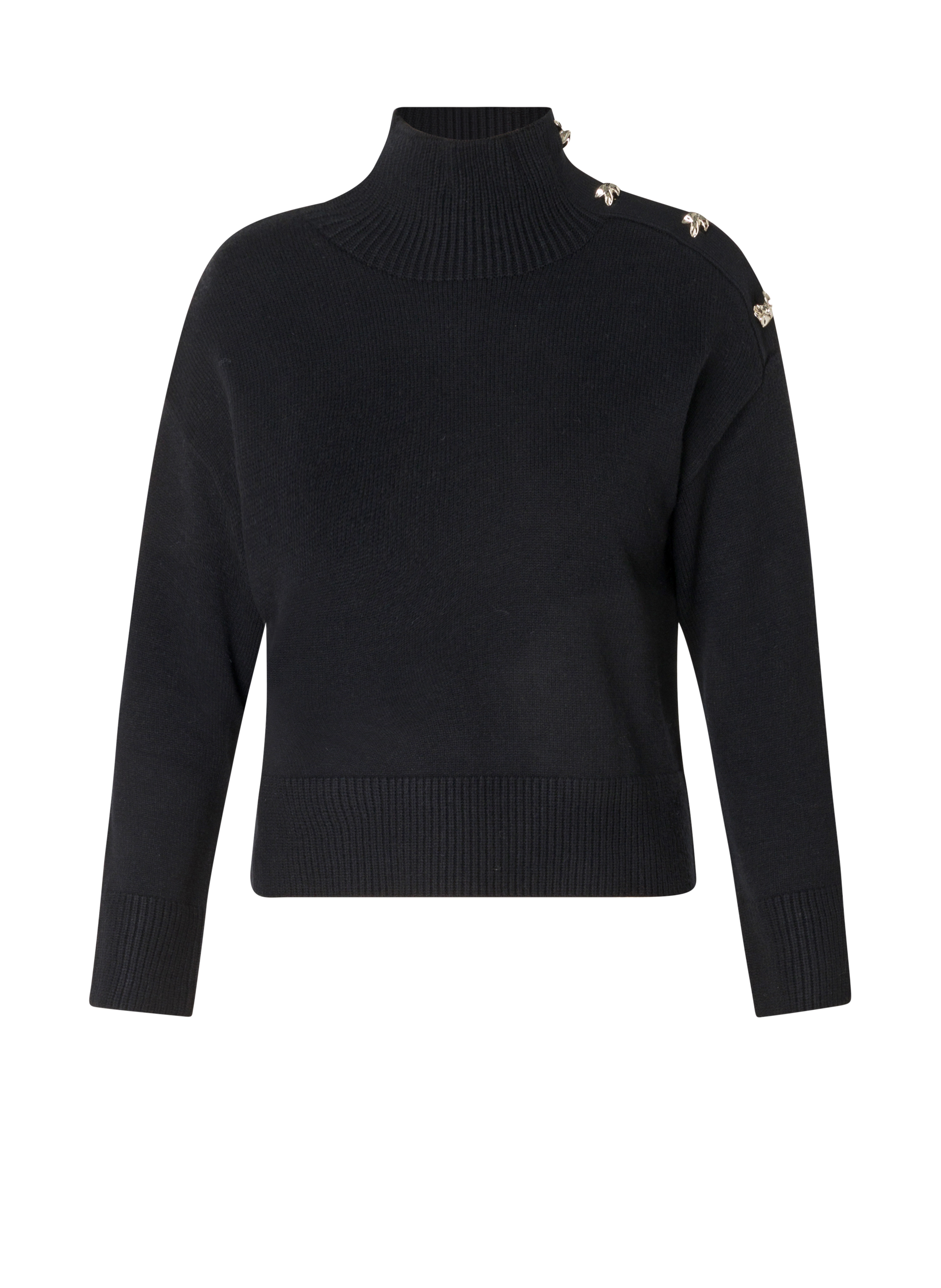 • Details: Opstaande kraag, knopen op schouder, kort recht model