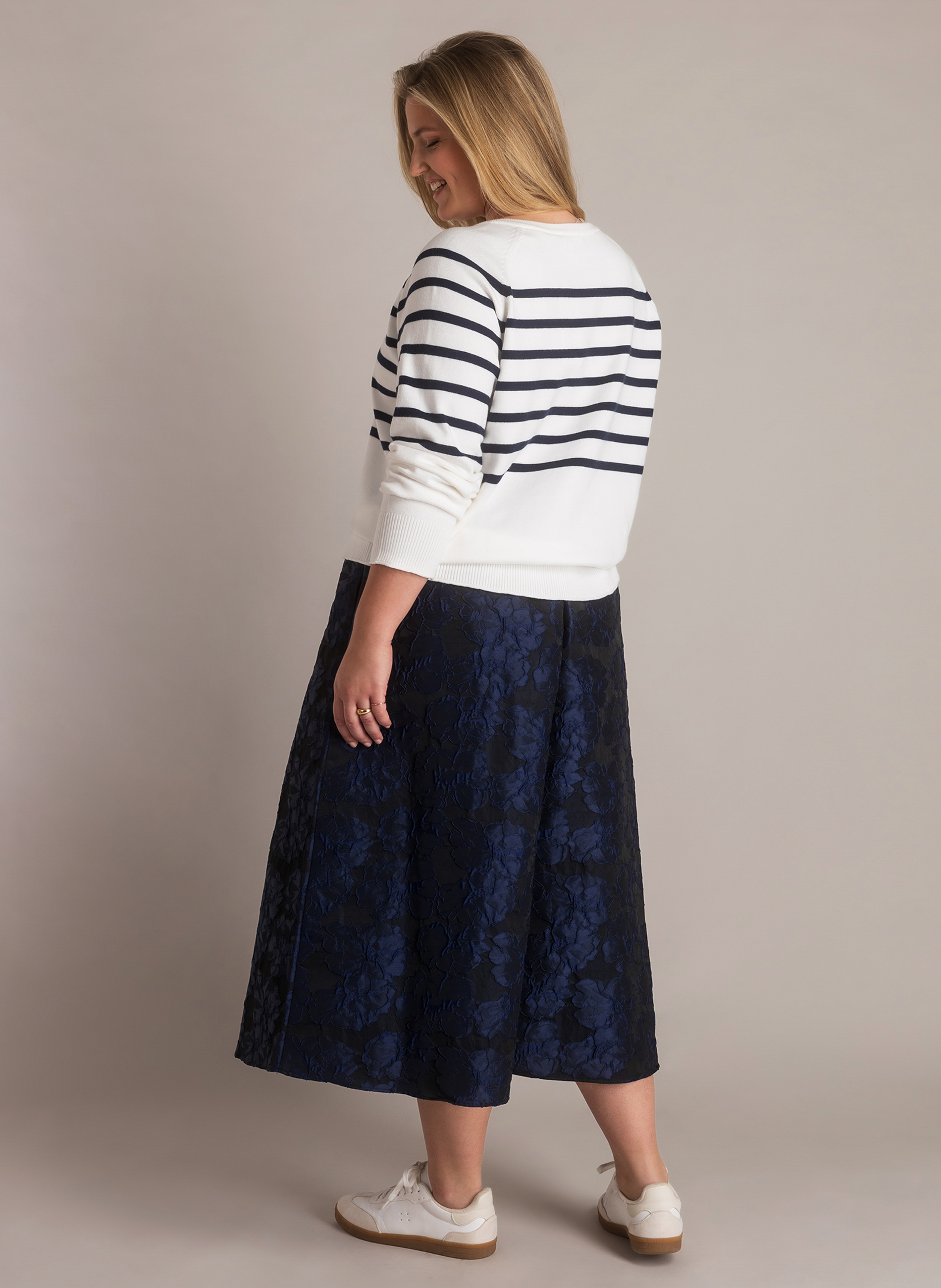 De marine-witte strepen geven de trui een tijdloze uitstraling, terwijl de gouden knopen op de schouder een subtiel en chic accent toevoegen. Dankzij de soepele kwaliteit blijft de trui comfortabel en mooi in model, ideaal voor dagelijks gebruik.