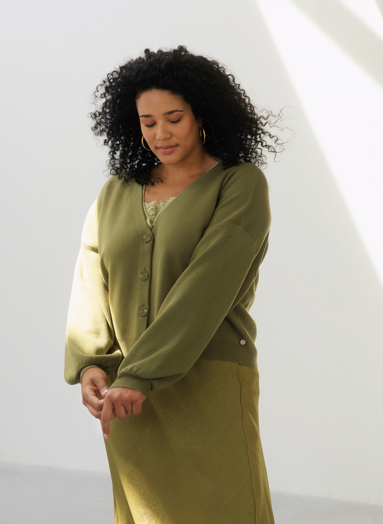 Het YEST CURVE Jelaina vest is een prachtig kledingstuk dat direct sfeer geeft aan je dagelijkse outfit. Dit vest is uitgevoerd in een zachte olijfgroene kleur, wat zorgt voor een natuurlijke en rustige uitstraling. Het merk YEST CURVE staat bekend om haar fijne ontwerpen die speciaal zijn gemaakt voor vrouwen die zoeken naar modieuze grote maten kleding. Dankzij de vrouwelijke V-hals en de prettige pasvorm is dit een item waarin je je de hele dag comfortabel voelt. Het is een ideaal kledingstuk om even snel over een top aan te trekken voor een complete look.