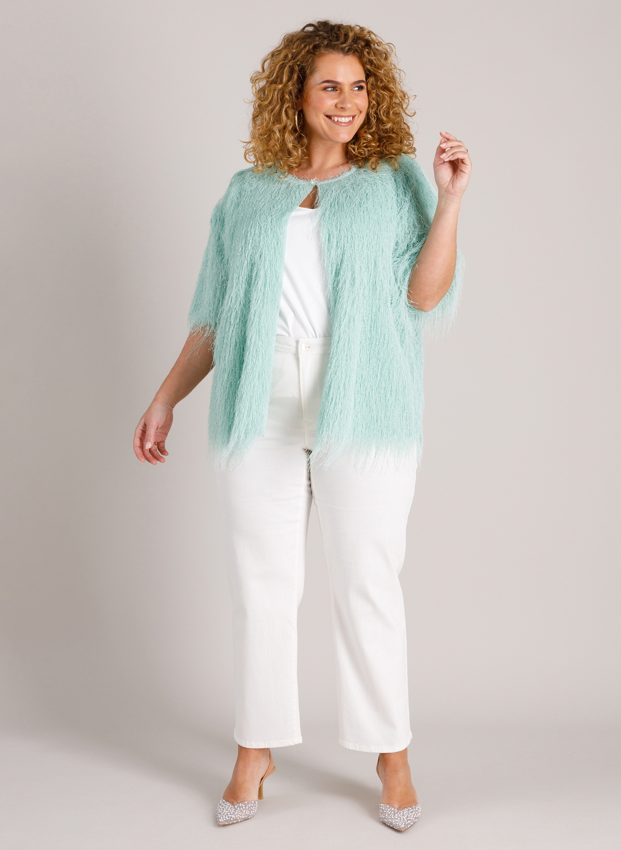 • Kenmerken: Harige structuur met korte mouwen en openvallende voorzijde