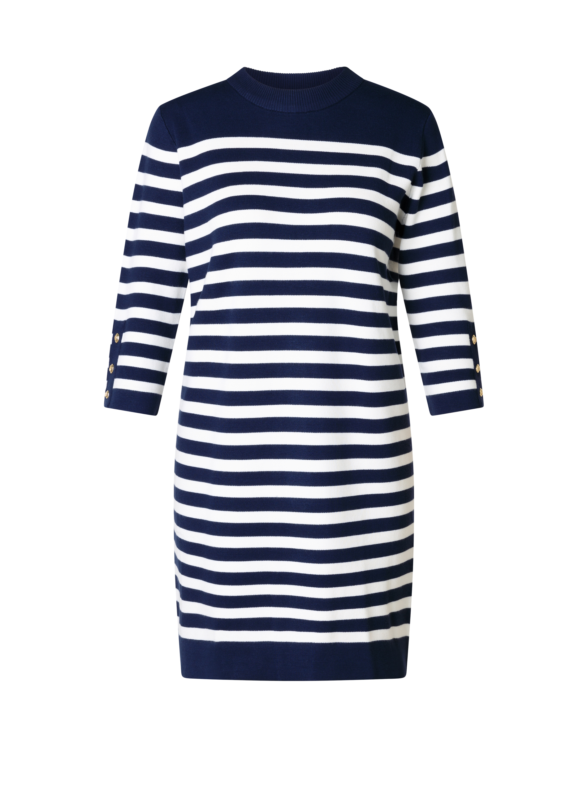 De horizontale navy-witte strepen geven de jurk een frisse, maritieme uitstraling. De ellebooglange mouwen en de lengte net over de knie zorgen voor een verzorgde en veelzijdige look, geschikt voor zowel casual als iets nettere gelegenheden.