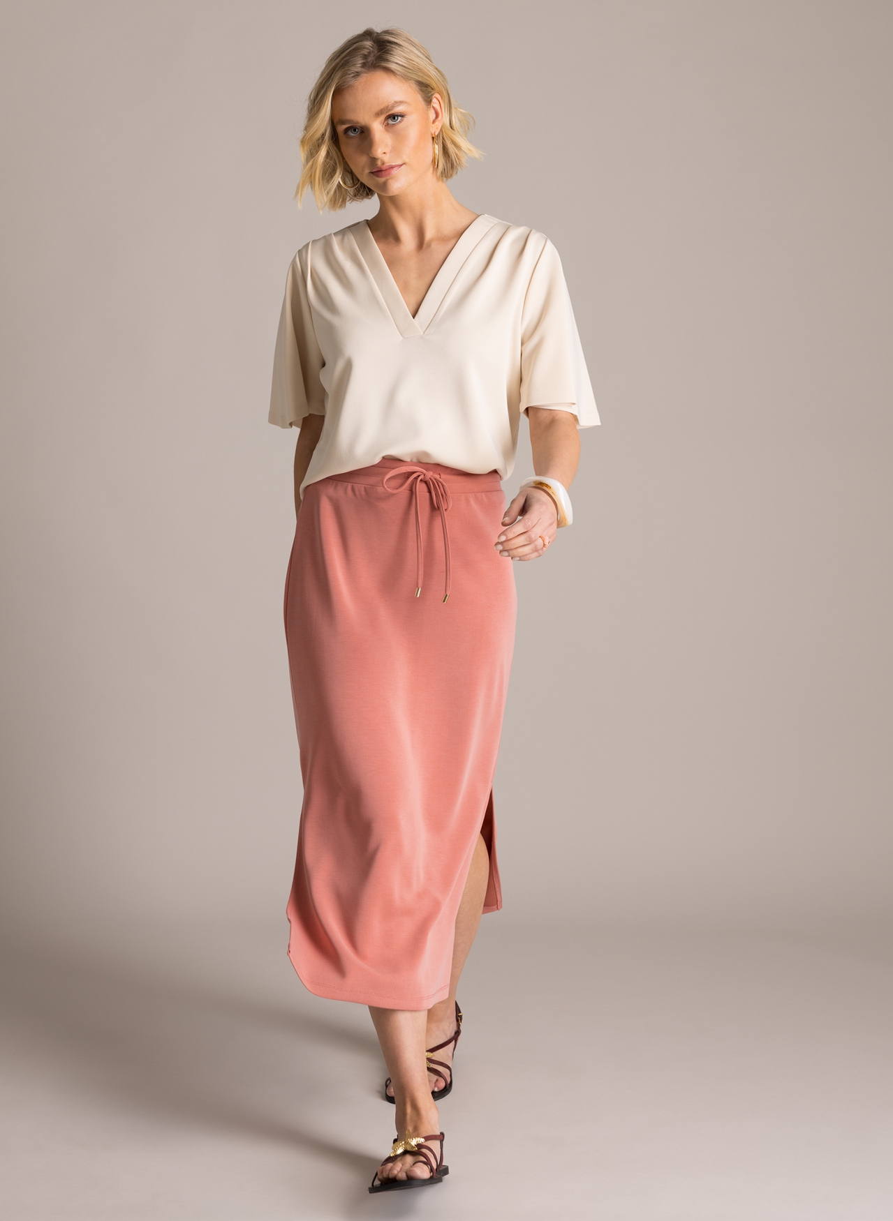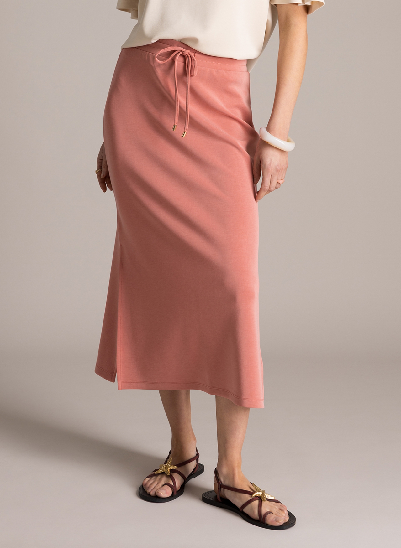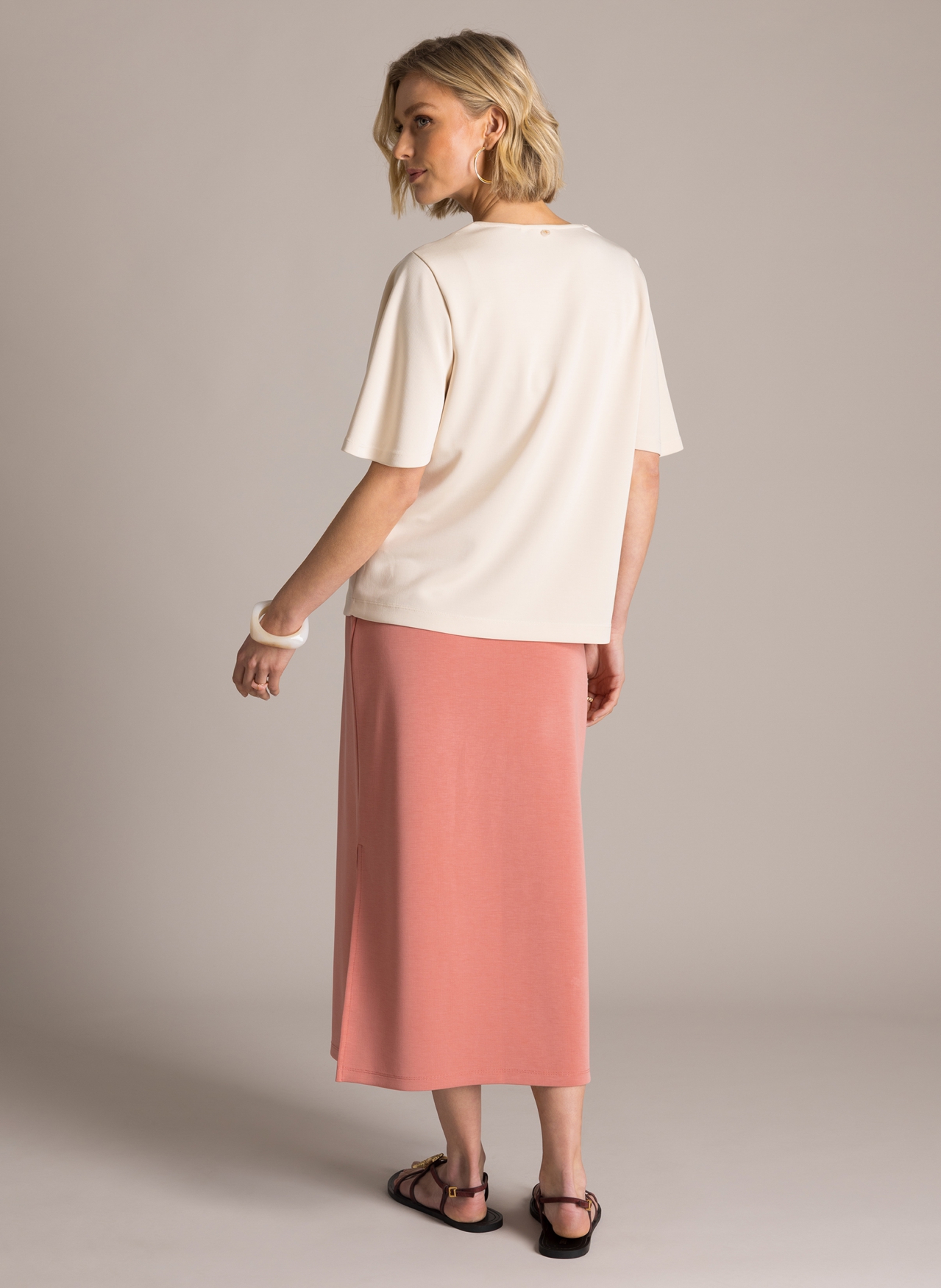 De Yest rok Kyra is gemaakt van een hoogwaardige modal-blend, waardoor de stof heerlijk zacht aanvoelt en soepel om het lichaam valt. Het model heeft een clean, recht silhouet dat net over de knie valt. Dankzij de elastische tailleband met een handig koordje kunt u de pasvorm naar wens aanpassen. Een subtiele split aan de onderzijde zorgt voor extra bewegingsvrijheid en draagcomfort. In de wereld van grote maten kleding is dit een ideaal basisitem voor een casual en verzorgde look. Bij Bagoes vinden we het belangrijk dat u zich prettig voelt in uw kleding, en deze comfortabele jersey rok helpt daar zeker bij.