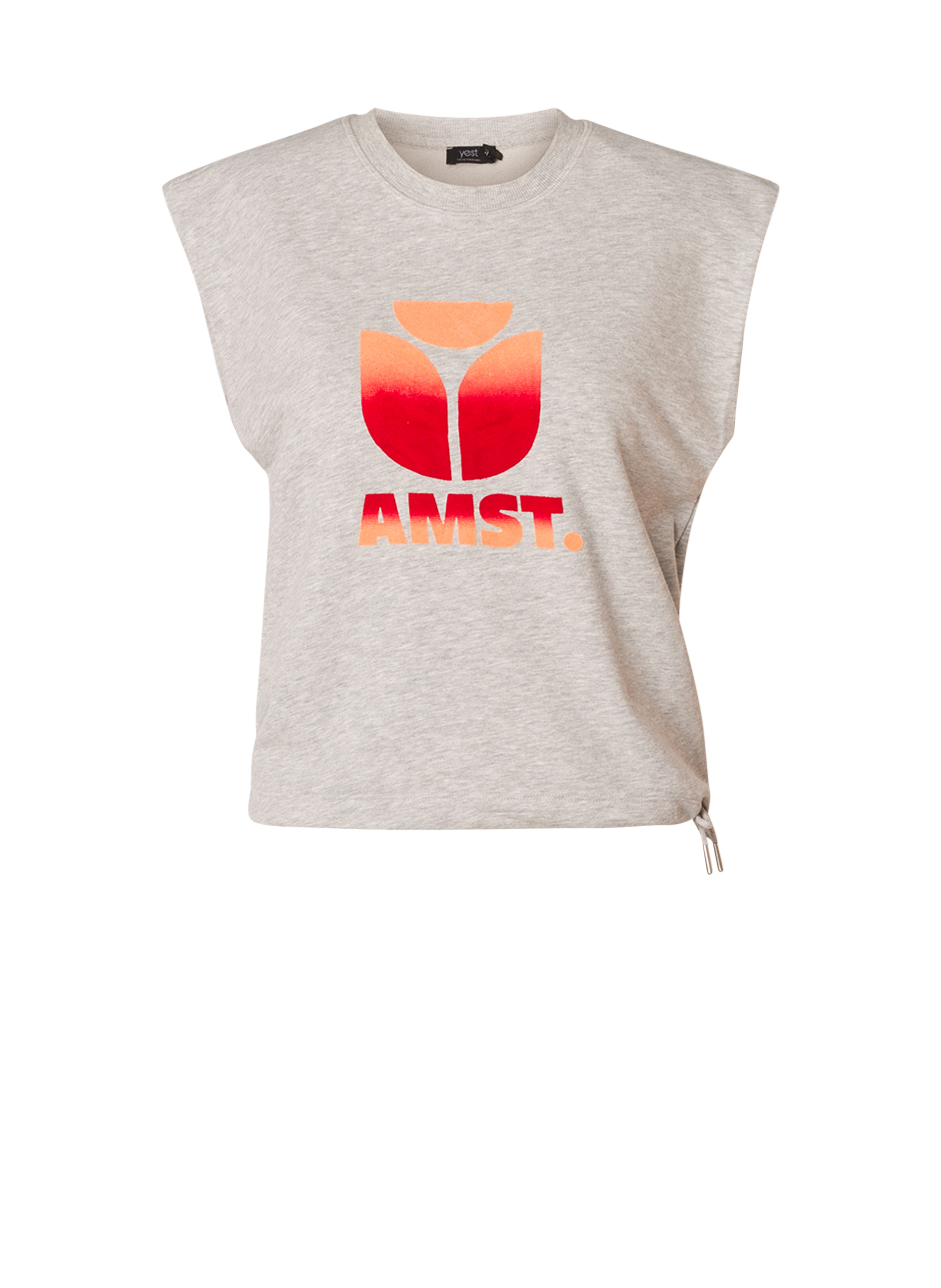 Cropped mouwloze sweater met een opvallende flock print aan de voorkant. De hals is rond en heeft een geribte boord. Deze grijs gemêlleerde sweater heeft wijde armgaten en een tunnel met een koordje aan de onderkant. Lengte 74 cm.