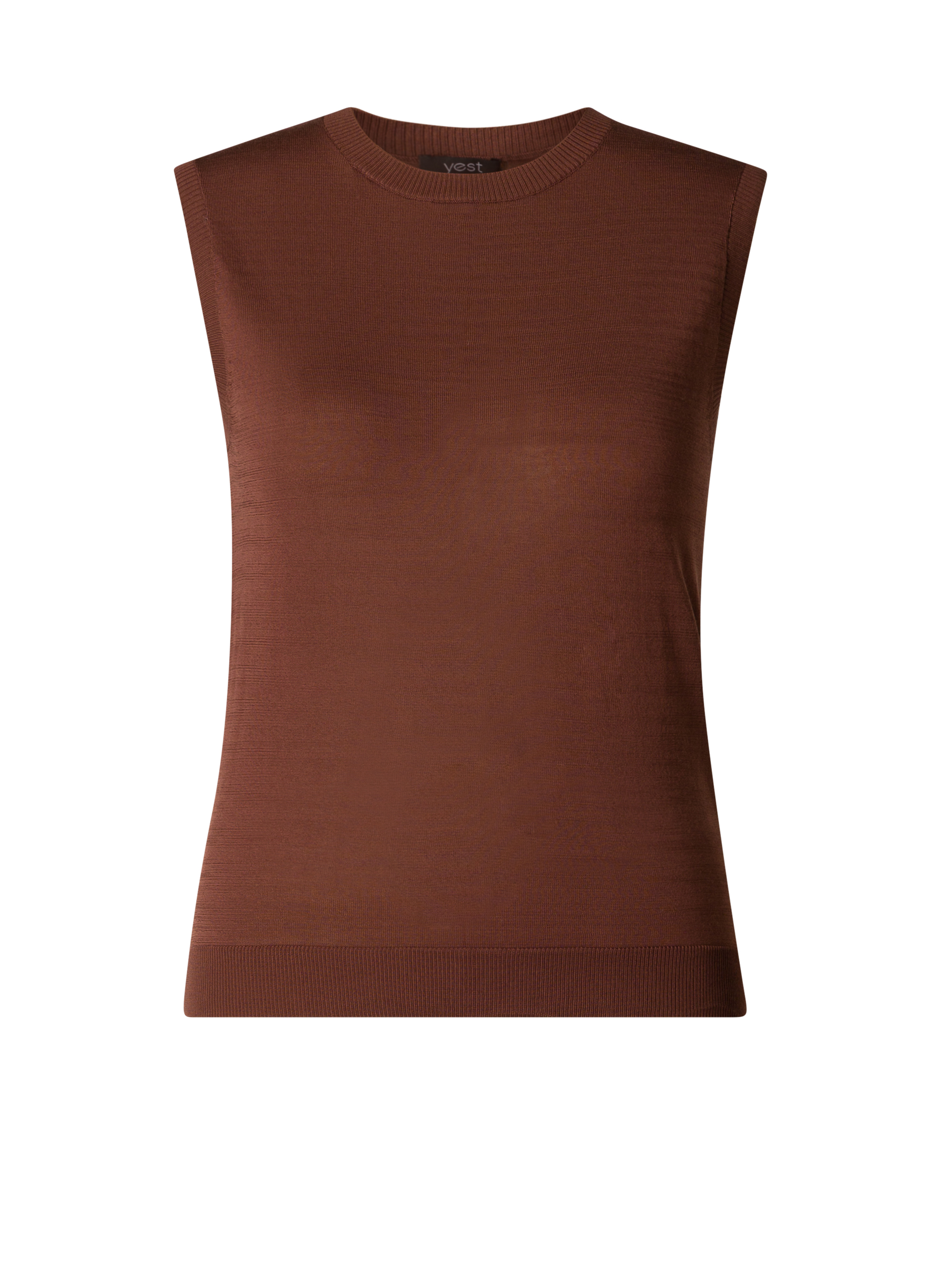 Mouwloze dunne trui in een mooie viscose mix uitvoering. Deze Yesta top is verkrijgbaar in 3 kleuren; Ecru, Leaf Green en Classic Brown. De Rocci is 60 cm lang.