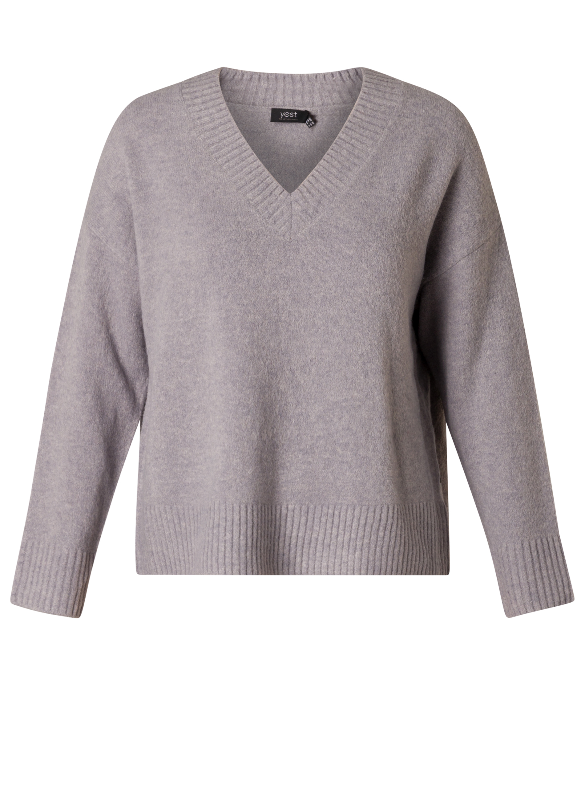 Deze zachte, grote warme Yesta trui met V-hals is perfect voor de koude dagen. De geribde boorden langs de hals, mouwen en onderkant zorgen voor een luxe afwerking en extra warmte. Ideaal om te combineren met je favoriete jeans of leggings voor een stijlvolle, cozy look! Verkrijgbaar in Grey Melange en Dark Blue. De Tatum is 70 cm lang.