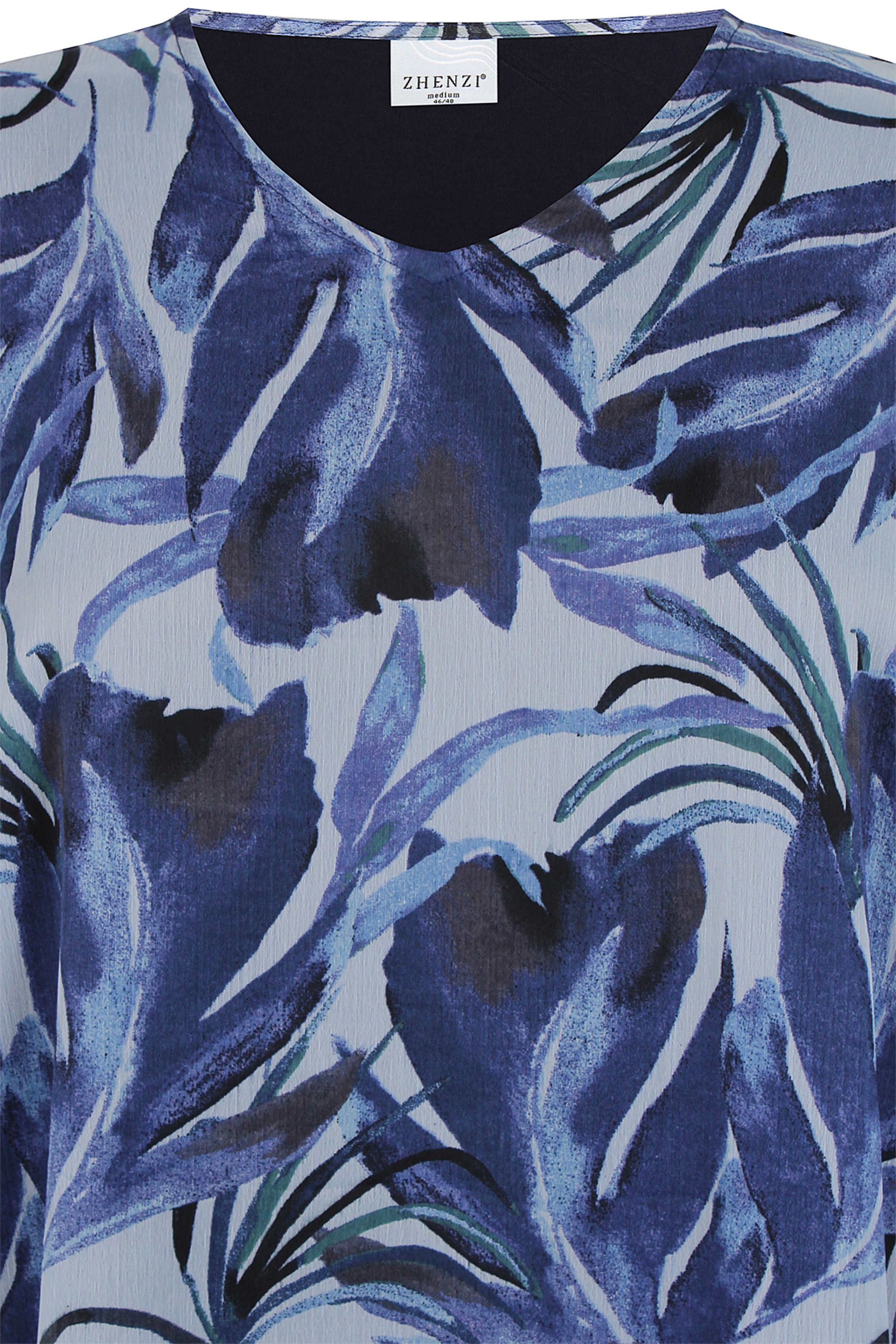 ZHENZI a-lijn tuniek heeft een groot bladprint, verkrijgbaar in 3 kleurstellingen. De tuniek is gemaakt in een voile stof, de panden zijn gevoerd en de lange pofmouwen schijnen door. In het achterpand zit in een deel van de taille een elastiek, zo sluit het model mooi aan in je rug. In het voorpand zit een deelnaad onder de buste. Het model combineert hier een basis legging.