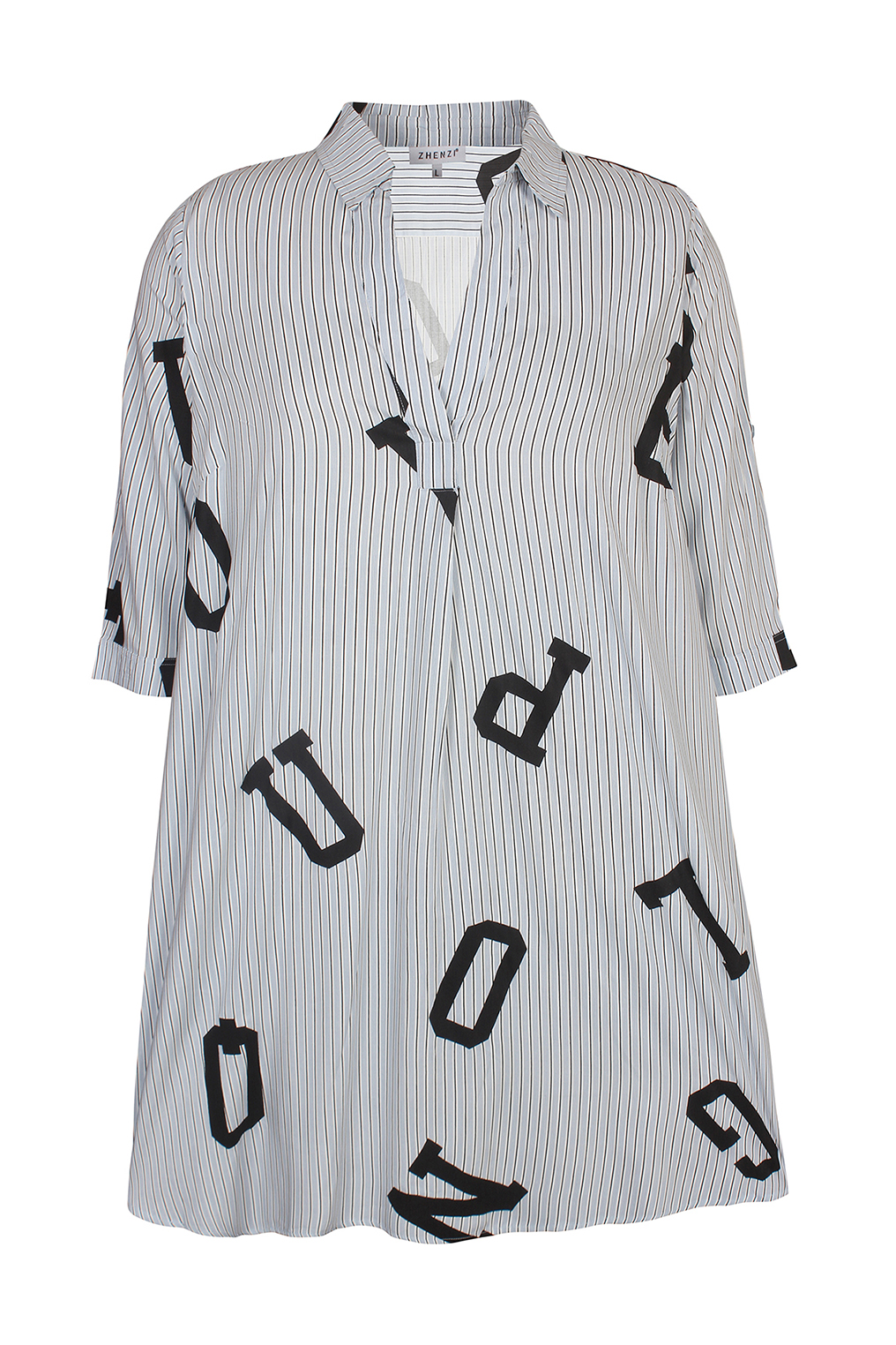 Hij is helemaal te gek deze streep blouse van Zhenzi met een grote letter opdruk die overal over de blouse zit. Dit model heeft een V hals en een kraagje. Het is een Alijn model met een driekwart mouw die een extra optreklusje heeft. De voorkant is iets korter dan de achterkant. Voor is hij 105 cm lang bij maat M. Op de foto draagt het model hieronder een shirt en een skinny broek. De mooiste blouses vind je in de categorie grote maten blouses.