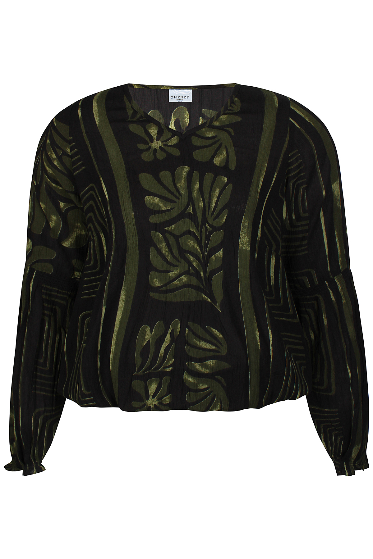 Elegante blouse van Zhenzi met een opvallend patroon van bloemen en grafische lijnen. De blouse heeft lange mouwen met elastische manchetten en een v-hals. Het lichte materiaal valt soepel en biedt veel comfort. De losse pasvorm maakt de blouse zowel stijlvol als makkelijk te dragen. Combineer deze blouse met een jeans of een nette broek.