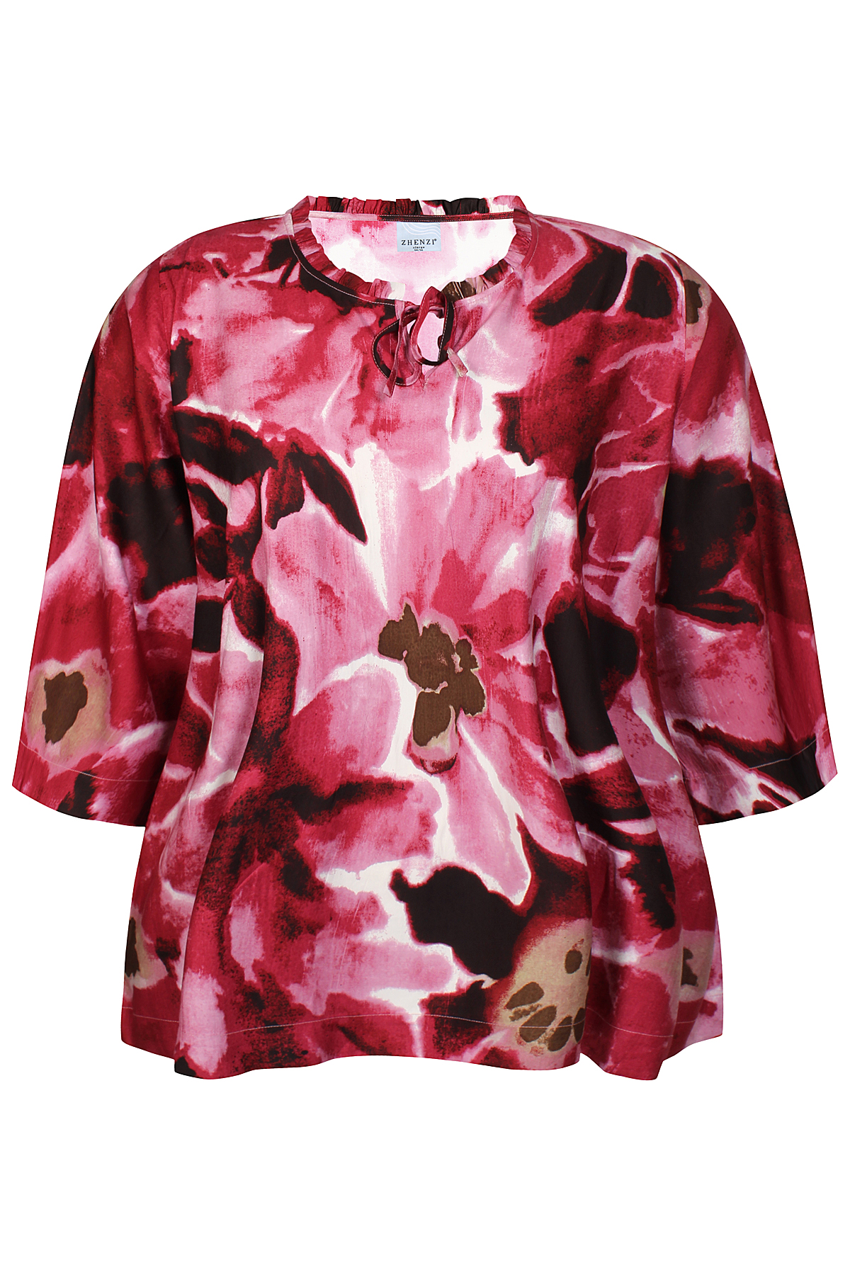 Deze blouse van Zhenzi heeft een opvallend en verfijnd ontwerp, met een levendig bloemenpatroon in tinten van fuchsia, donkerrood en subtiele beige accenten. De blouse heeft een losse, comfortabele pasvorm met een luchtige.