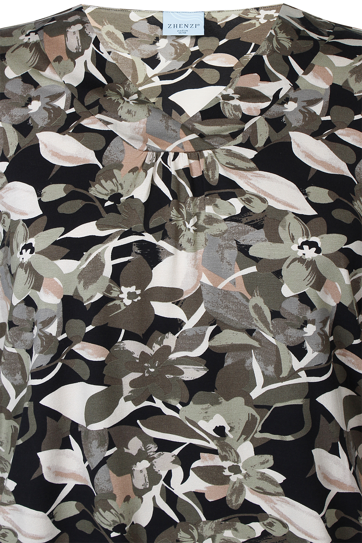 De print bestaat uit grote bloemen in twee kleuren - stone green/maroon op een zwarte ondergrond. Door het opvallende patroon is deze blouse geschikt voor wie een uitgesproken bovenstuk zoekt dat zonder verdere details gedragen kan worden. De blouse heeft geen sluiting en wordt over het hoofd aangetrokken. De lengte valt tot op de heup en is geschikt om los te dragen of deels in de broek te steken.