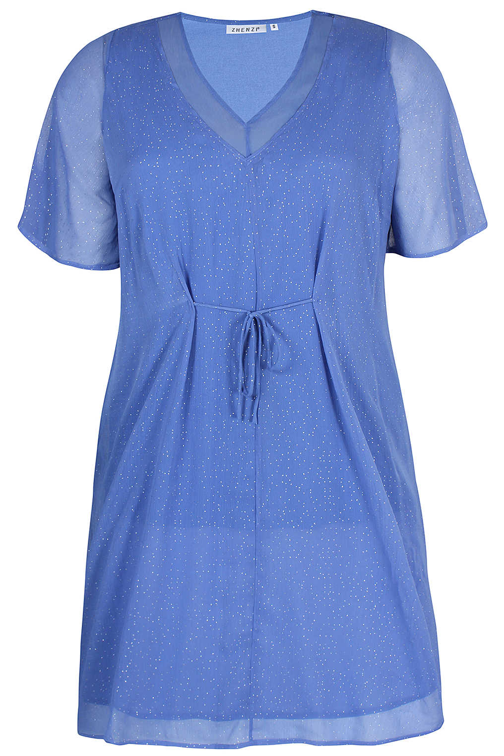 Wat een mooie feestelijke jurk van Zhenzi model MEGANE. Hij is gemaakt in een voile stof met een zilver kleurig glitter stipje. Hij heeft een V hals, waarbij de hals van de binnenvoering jurk te zien is. De hals van de buitenstof is dus iets lager. In de voor taille zitten 2 koordjes die je kunt aantrekken, zo kun je zelf bepalen hoe je de jurk witl dragen. Makkelijk bij een Kerstdiner! Aan de zijonderkant zitten splitten van 31cm. De jurk heeft korte mouwen die iets uitlopen en doorschijnen. De lengte van de jurk is 114 cm bij maat M, dus over de knie. Prachtig met een mooie panty van Cette.