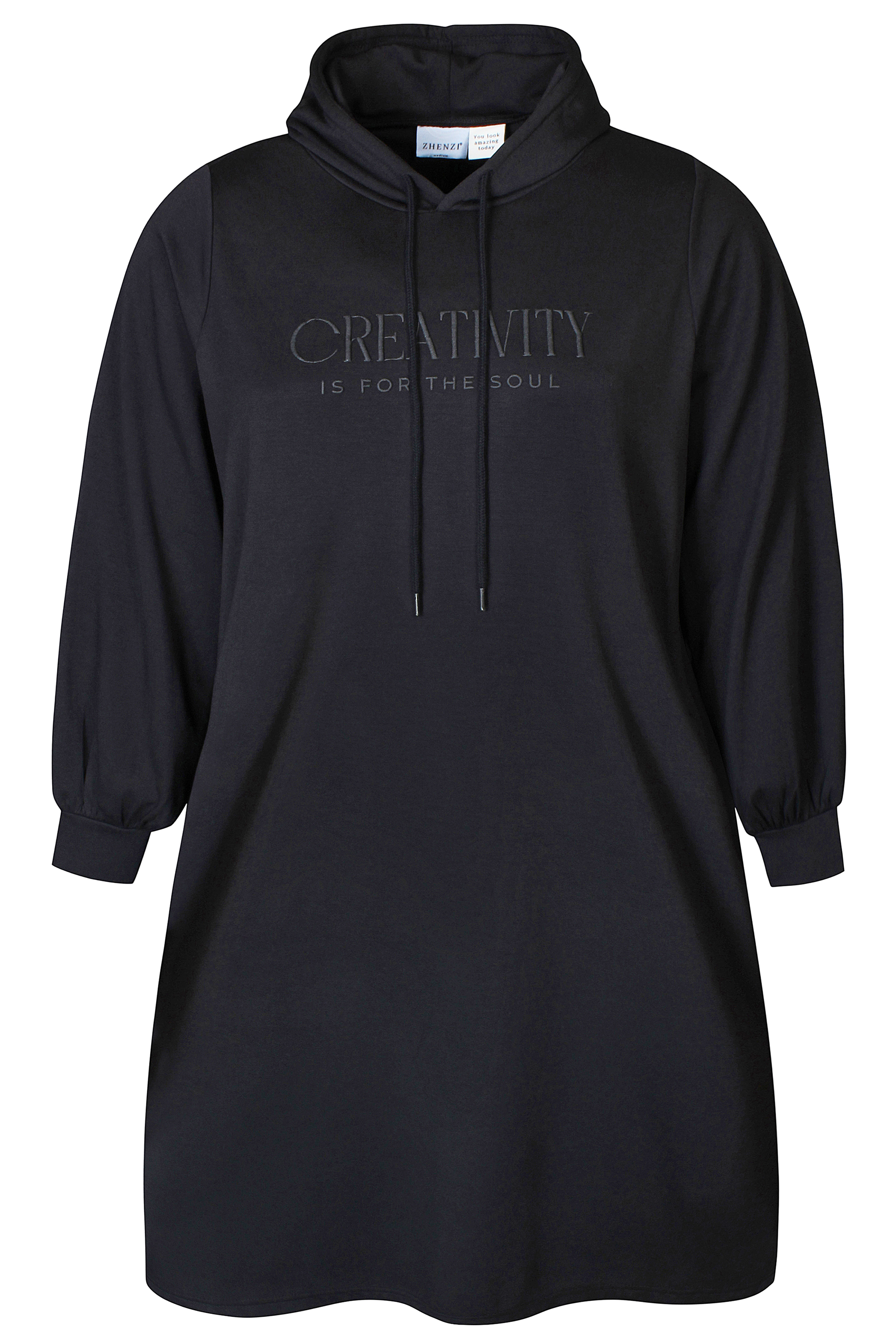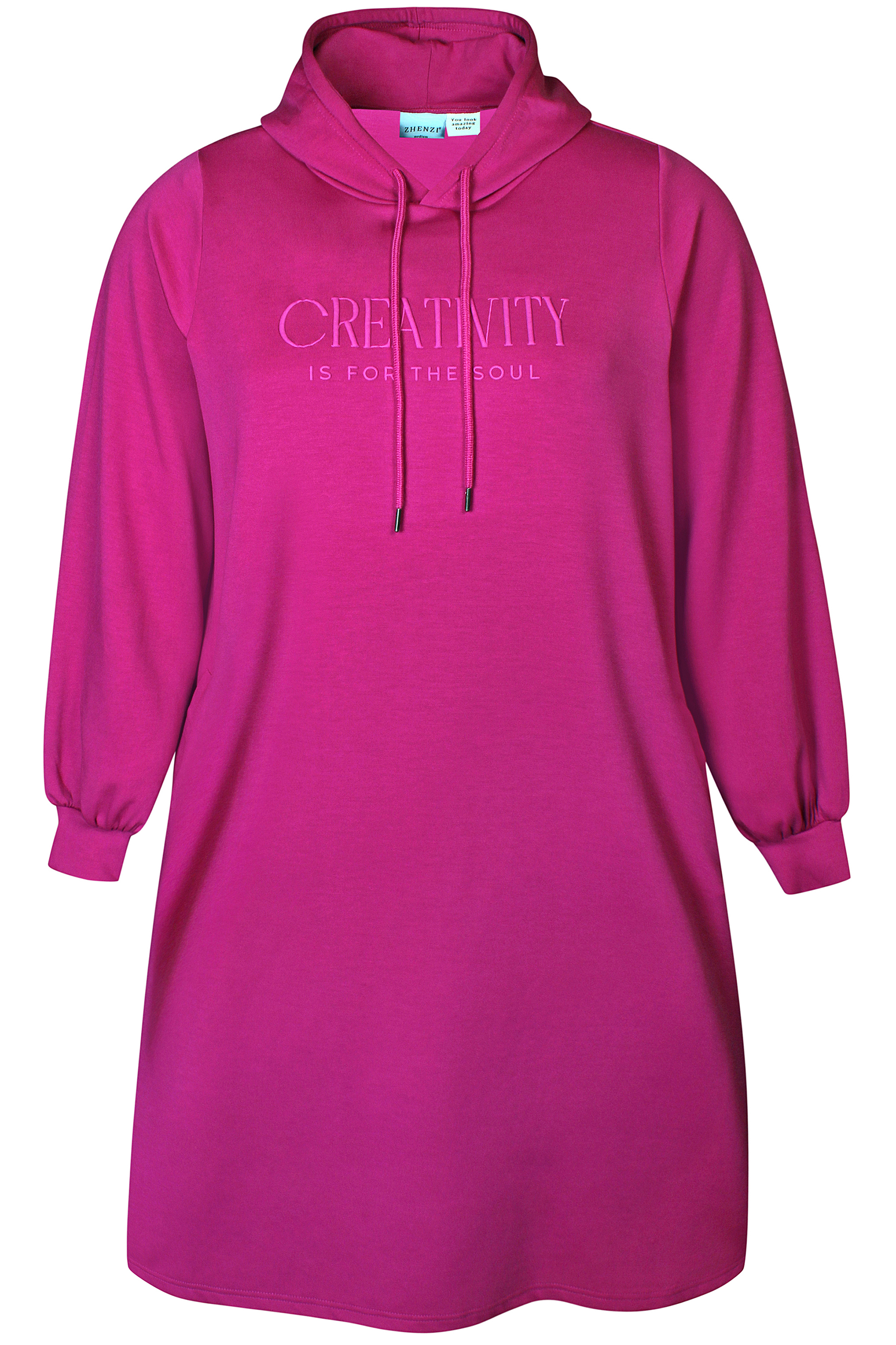 ZHENZI jurk Mya is gemaakt in een mooie kwaliteit jersey, die voor het najaar iets dikker is. De jurk heeft een capuchon met aantrekkoord en zakken in het voorpand. De lange mouwen hebben een boord en vallen poffend. Aan de zijonderkant zitten splitten van 29 cm. Op de voorkant staat de tekst Creativity is for the soul. de legging die het model eronder draagt is artikel 200360. Dit model valt over de knie en heeft een Alijn pasvorm. Voor andere leuke jurken kunt u kijken in de categorie grote maten jurken.