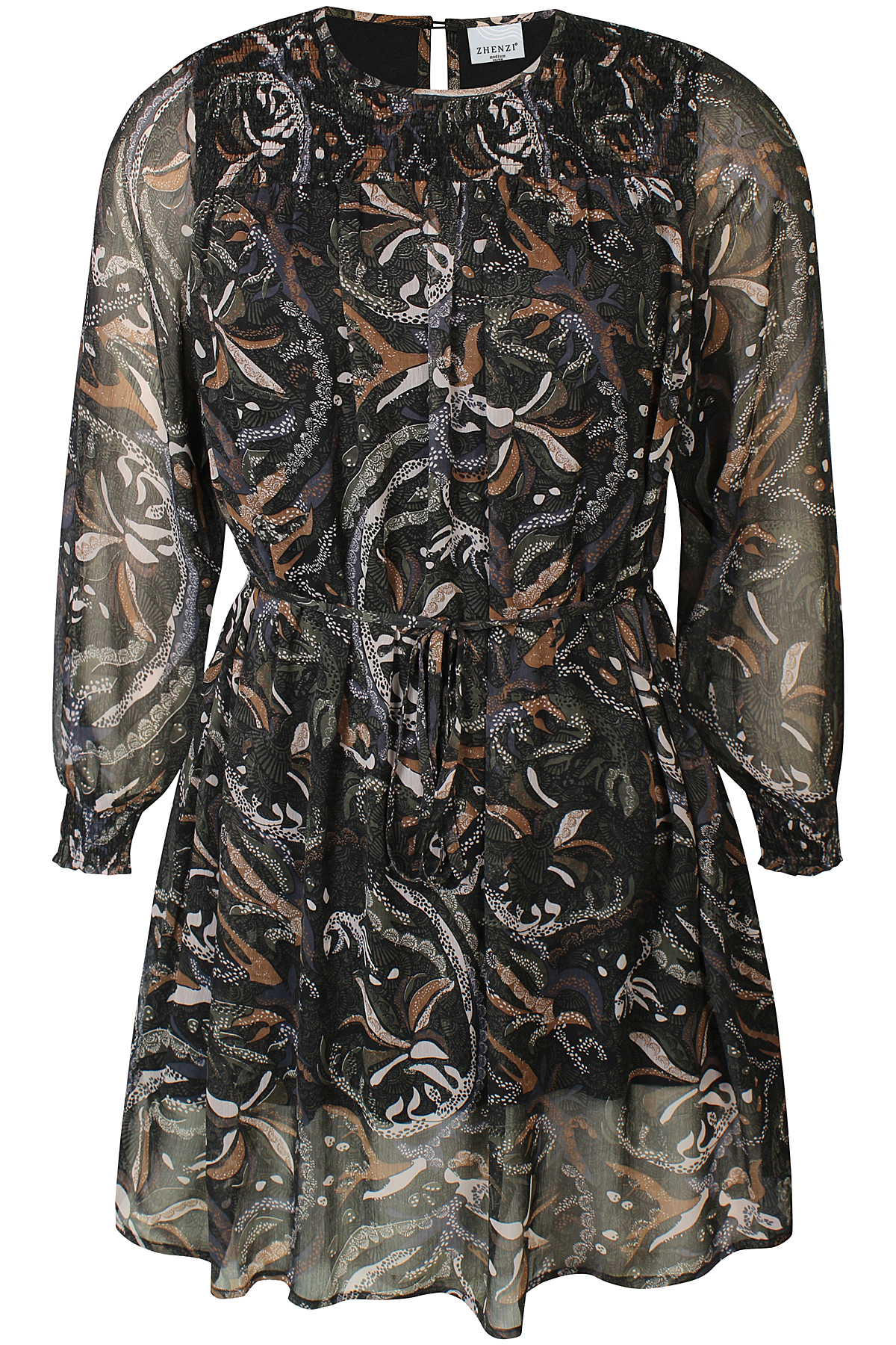 Mooie jurk van Zhenzi met een kleurrijk bloemenpatroon in warme tinten. De jurk heeft lange mouwen met elastische boorden en een losse, comfortabele pasvorm. Geeft een luchtige uitstraling. Goed om te dragen met een legging. Perfect voor verschillende gelegenheden.