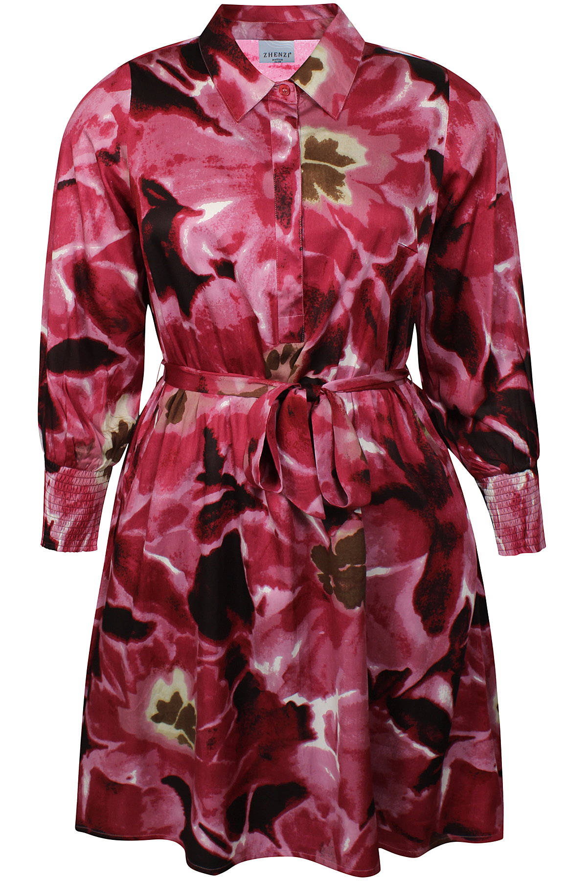 Stijlvolle jurk van Zhenzi met een prachtig bloemenpatroon in roze of blauwe kleur. De jurk heeft lange mouwen met elastische manchetten en een klassiek overhemdkraagje. De losse pasvorm wordt geaccentueerd door een bijpassende riem in de taille. Deze jurk is ideaal voor zowel casual als iets formeler en makkelijk te combineren met een paar mooie accessoires.