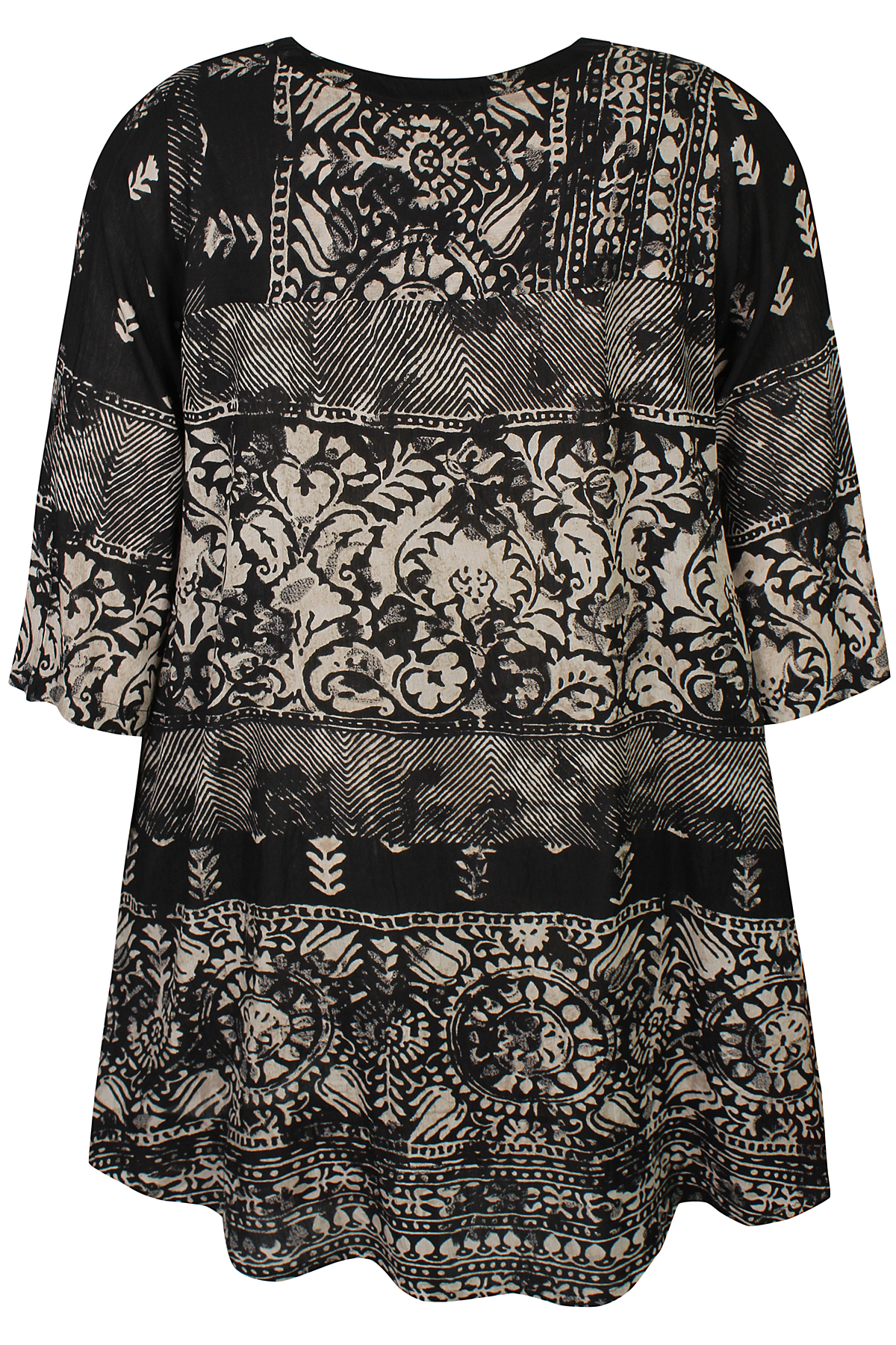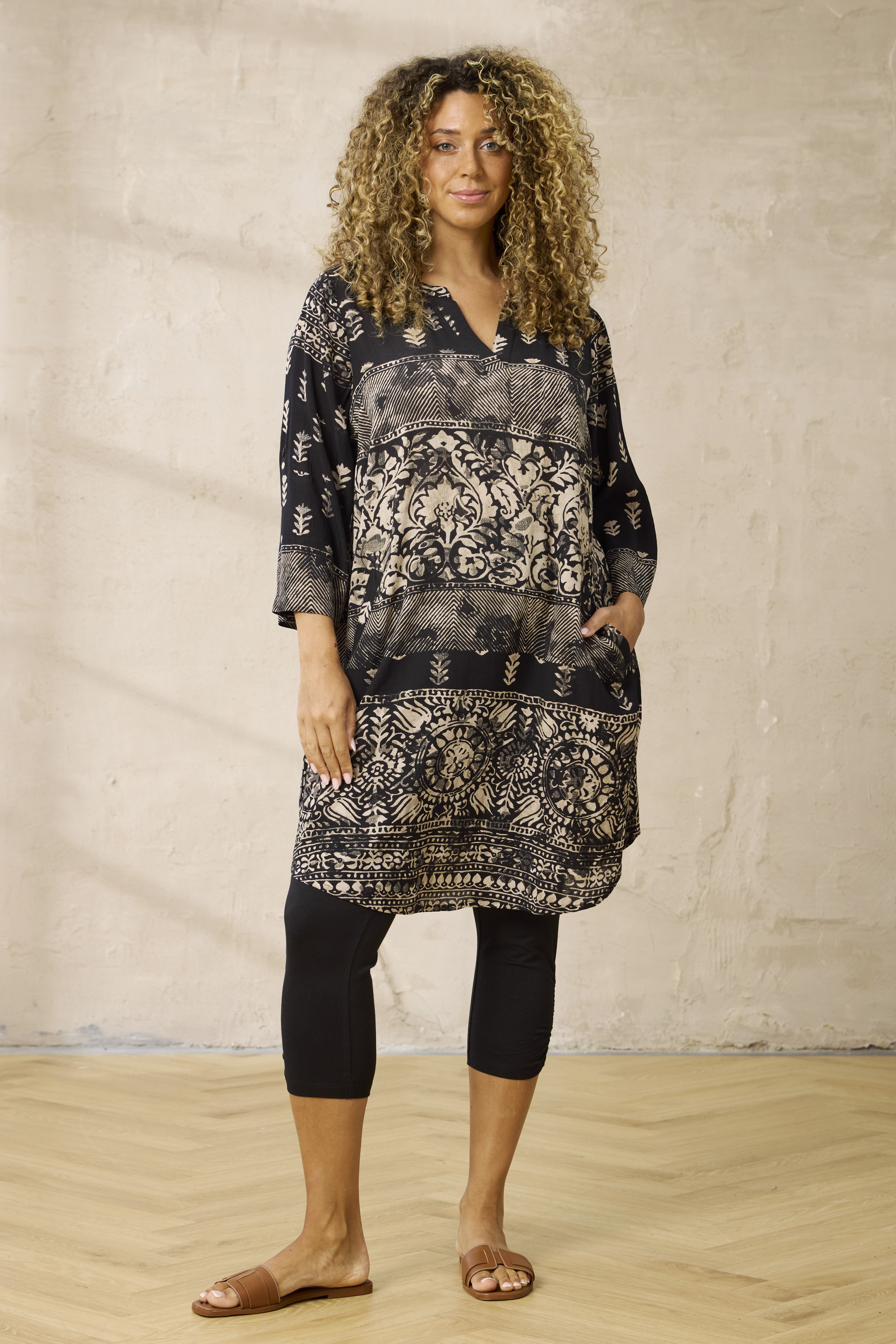 Deze stijlvolle tuniek is een echte blikvanger dankzij de speelse mix van prints in zwart, beige en taupetinten. Het model heeft een comfortabele, losvallende pasvorm die soepel om het lichaam valt en zorgt voor een flatterend silhouet. De ronde halslijn en driekwart mouwen geven de tuniek een tijdloze en veelzijdige uitstraling.